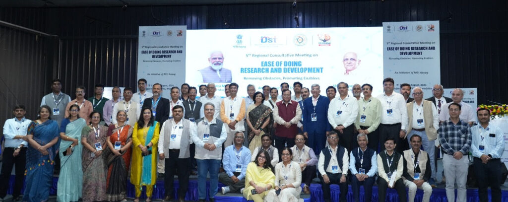 New Delhi, Delhi, 14th of August 2025 :  NITI Aayog held the Fifth Consultative Meeting on “Ease of Doing Research & Development (R&D)” hosted by GUJCOST at Science City, Ahmedabad on 12-13 August 2025, bringing together over 110 participants, the heads of academic institutes and research institutions, and policymakers, to deliberate on strategies for strengthening India’s research and innovation ecosystem. The meeting aimed to build consensus on reducing procedural barriers, increasing access to knowledge resources, enhancing institutional competitiveness, increased emphasis on translational research, and fostering a more enabling environment for R&D in the country.