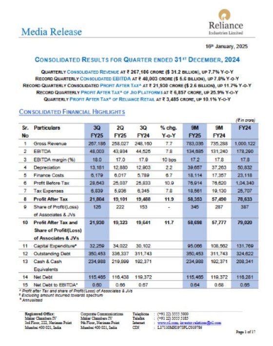 Mumbai, 16th of January, 2025 : Financial And Operational Performance Of Reliance Industries Limited (RIL) Unaudited Standalone Financial Results Of Reliance Jio Infocomm Limited (RJIL) For The Quarter And Nine Months Ended 31st December 2024.