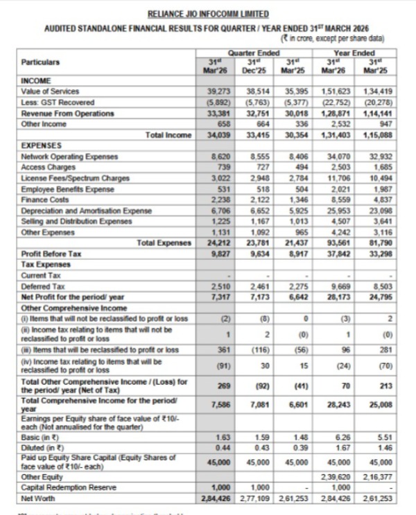 Mumbai, Maharashtra, 24th of April 2026 : Financial Results Of Reliance Jio Infocomm Limited (RJIL) For The Quarter And Year Ended 31st March 2026.