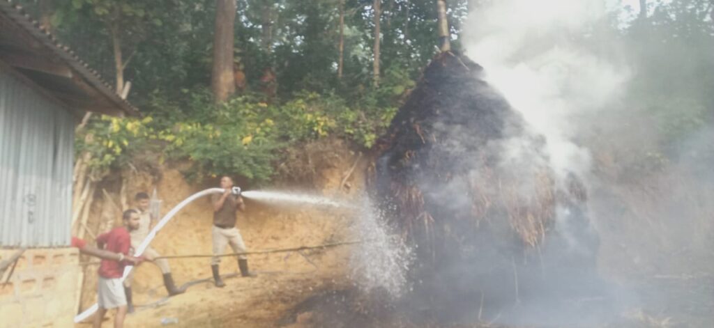 Teliamura, 7th of February 2024 : The fire in Paddy Straws stack, the entire area including the residential house was saved from the major fire. The incident took place on Wednesday (7th February, 2024) morning in DM Colony area under Teliamura Police Station. According to the details of the incident, the local residents witnessed the fire in the paddy straws stack of Girendra Roy of DM Colony area. Local womens including the owner of paddy straws stack tried to control the fire by water in buckets. Later the incident was informed to fire brigade personnel over this occurrence. The fire brigade personnel arrived on the spot after receiving the information. The fire spread to the other side. The fire brigade personnel and local residents brought the fire under control with joint efforts. Afterwards the residents got relief. It is assumed that this fire may be caused by cigarette or something like that, according to fire brigade personnel.