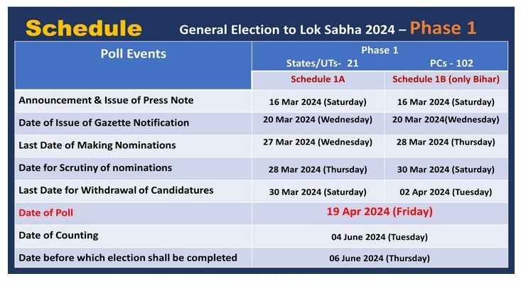New Delhi, 20th of March, 2024 : Nominations have begun to be filed in the First Phase of General Elections this morning. This comes after Election Commission of India today issued a Gazette notification for 102 Parliamentary Constituencies across 21 States/UTs going for polls in the General Elections to Lok Sabha 2024. The polling in these PCs in Phase 1 will take place on 19.04.2024.