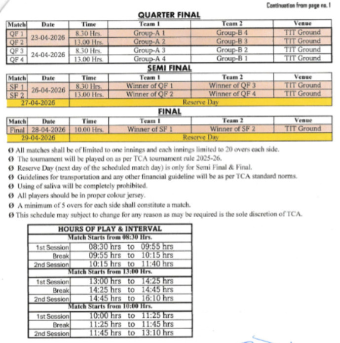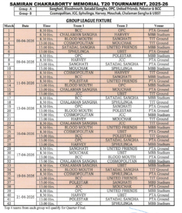 Agartala, Tripura, 3rd of April, 2026 : Fixture Of Samiran Chakraborty Memorial T20 Tournament 2025-26.