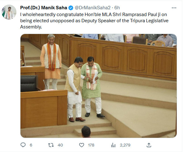 “I wholeheartedly congratulate Hon’ble MLA Shri Ramprasad Paul ji on being elected unopposed as Deputy Speaker of the Tripura Legislative Assembly”, Hon’ble Chief Minister Dr. Manik Saha tweeted.