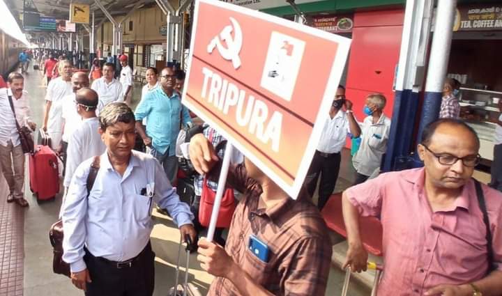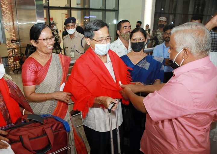 Former Chief Minister of Tripura, Member of Politburo, Communist Party of India (Marxist) and Present opposition leader Manik Sarkar, CPI(M) Tripura State Committee Secretary Jitendra Chaudhury and other leaders on Tuesday (5th April, 2022) arrived in Kannur to attend the 23rd CPI(M) party congress. Former State CM and Present opposition leader Manik Sarkar, CPI(M) Tripura State Committee Secretary Jitendra Chaudhury and other leaders were greeted by Kerala CPI(M) leaders at Kannur airport.