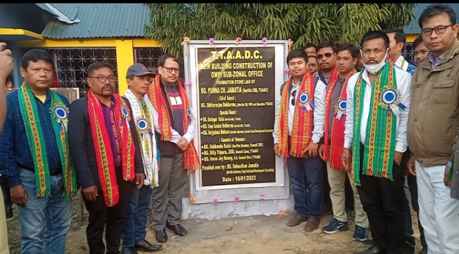 The new building foundation stone of Ampi sub zonal office has been laid by Chitta Ranjan Debbarma, EM PWD & Education, TTAADC here in the present sub zonal office premises in Ampinagar, Gomati Tripura today. To promote the infrastructural activities more advanced of Ampinagar sub zonal office the concerned TTAADC authority has taken this new office building construction project to create better development status in Ampinagar. In the presence of many dignitaries of the programme EM Chitta Ranjan Debbarma has laid the foundation stone of this new sub zonal office building.