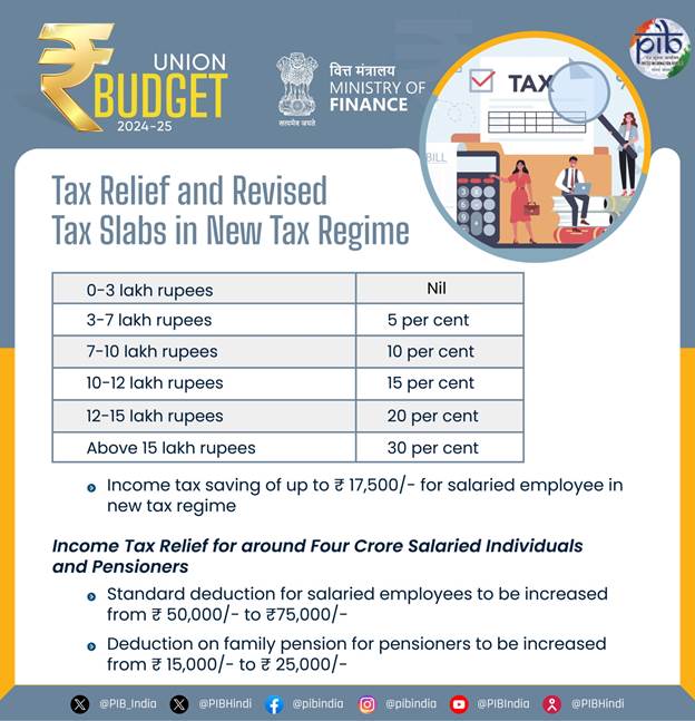 Finance Minister proposed to increase the standard deduction for salaried employees from ₹50,000 to ₹75,000. Also, deduction on family pension for pensioners is proposed to be enhanced from ₹15,000 to ₹25,000 under the new tax regime. This will provide relief to about four crore salaried individuals and pensioners.