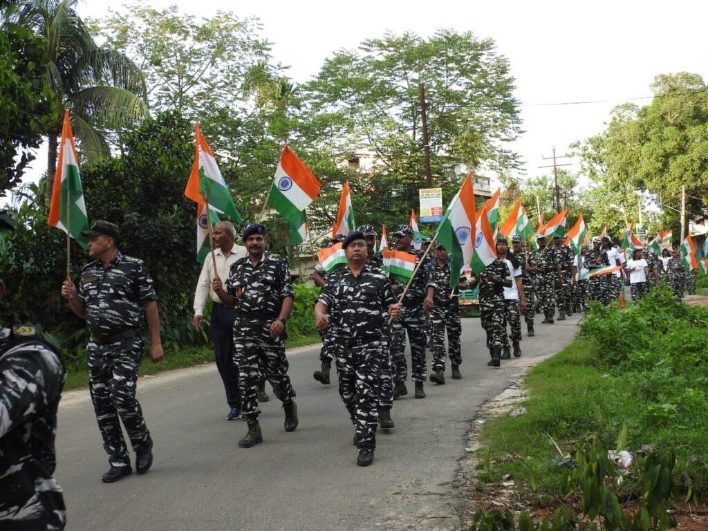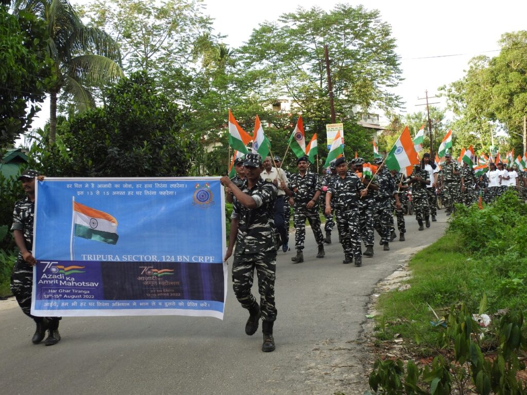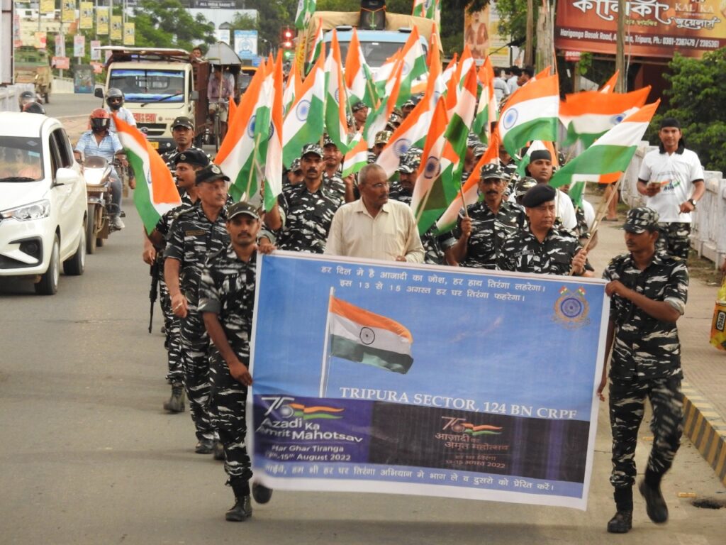 Under the able guidance and supervision of Mukesh Tyagi Commandant, 124 Bn CRPF organized procession /campaign of the local people in the AOR of A/124, C/124 Bodhjungnagar, Agartala market, G B Pant Hospital and Hejamara area. Under The “AZADI KE AMRIT MOHATSAV” Har Ghar Tiranga celebration. In the procession local people are also actively participated. Targeting to create awareness over country’s sovereignty and patriotic atmosphere amidst the common people the battalion officials have conducted like this programme. In the eve of independence day celebration the battalion officials have poured patriotic spirit among the people of state. The organizer has given message to people here to hoist national flag in every house to make the national integration more stronger.