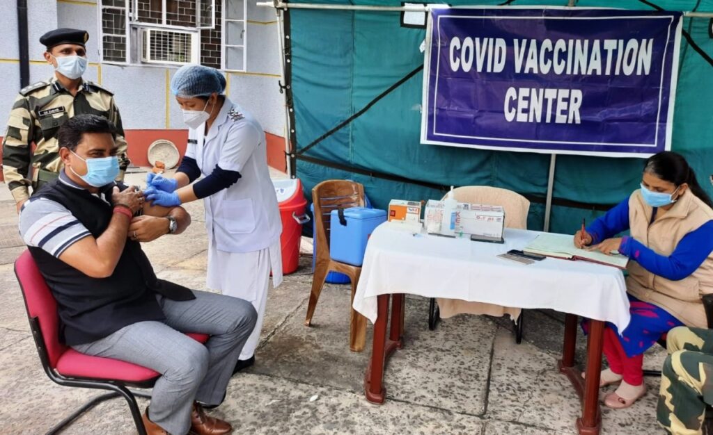 Health workers giving COVID vaccine in the BSF Headquarters, Salbagan Agartala on Friday (14th January, 2022).