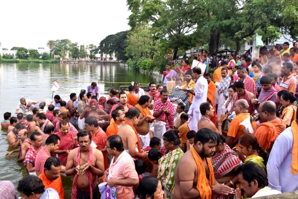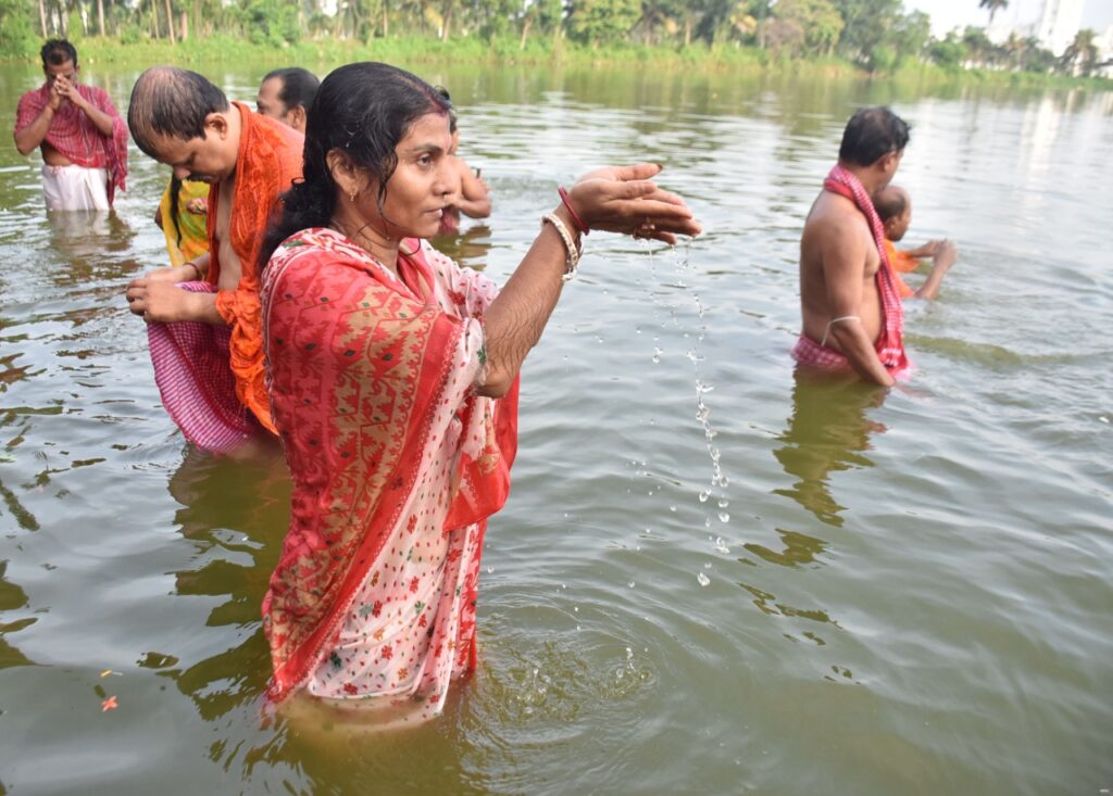 Hindu devotees perform ‘Tarpan’ rituals for the souls of their departed ancestors during the holy day of ‘Mahalaya’ in Agartala on Sunday (25th September, 2022).