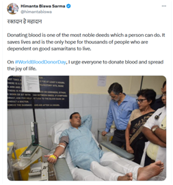 “Donating blood is one of the most noble deeds which a person can do. It saves lives and is the only hope for thousands of people who are dependent on good samaritans to live. On #WorldBloodDonorDay, I urge everyone to donate blood and spread the joy of life.”, Hon’ble Chief Minister of Assam Himanta Biswa Sarma tweeted.