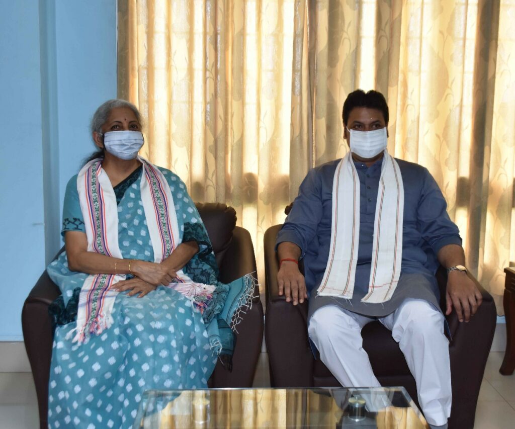 Hon’ble Chief Minister Biplab Kumar Deb welcomes Hon’ble Finance and Corporate Affairs Minister of India Nirmala Sitharaman at State Guest House, Agartala on Today (27th August, 2021).