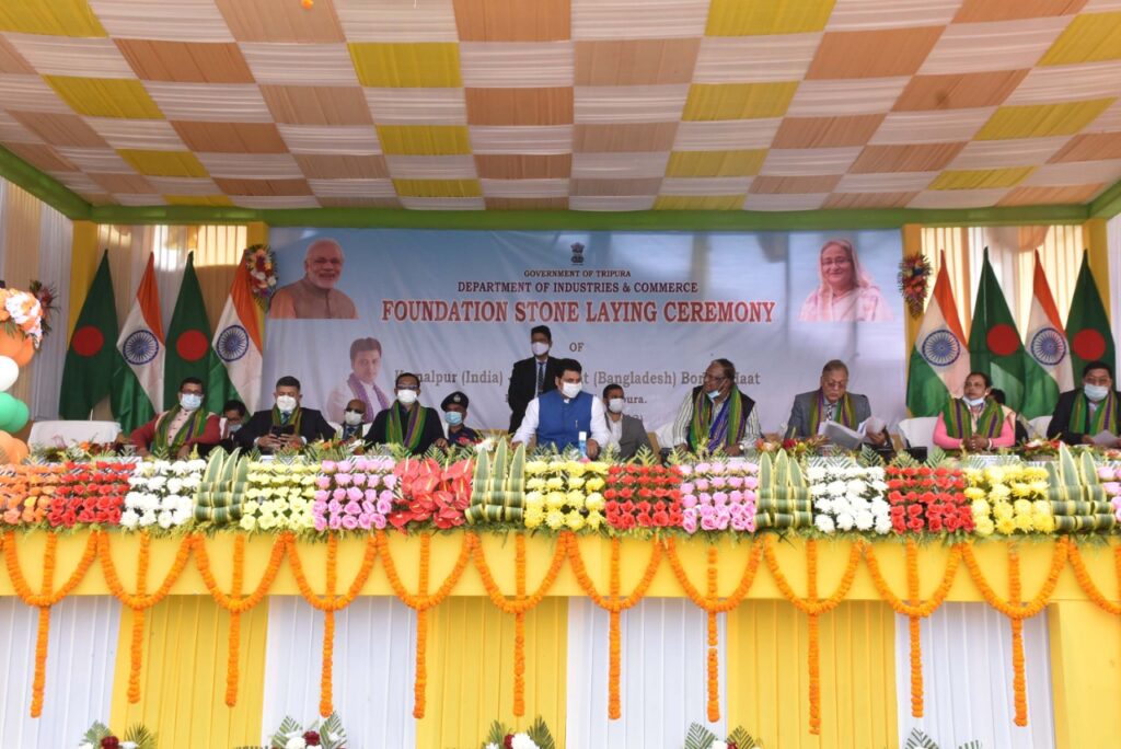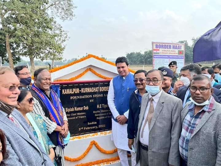 Hon’ble Chief Minister of Tripura Biplab Kumar Deb laid the foundation stone of Kamalpur (India) – Kurmaghat (Bangladesh) Border Haat at Kamalpur on Thursday (3rd February, 2022). Hon’ble Commerce Minister of Bangladesh Tipu Munshi, Indian High Commissioner to Bangladesh, Vikram Duraiswami, Hon’ble MP of Bangladesh Md. Abdus Shahid, Hon’ble Food, Civil Supplies & Consumer Affairs, Industries & Commerce Minister of Tripura Manoj Kanti Deb, Tripura Industrial Development Corporation (TIDC), chairman Tinku Roy and other dignitaries were present.