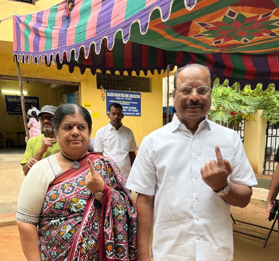 Hyderabad/Tripura, 13th of May 2024 : Hon’ble Governor of Tripura Indrasena Reddy Nallu cast his vote at a polling booth in GHMC community hall under Saleem Nagar area of Malakpet in Hyderabad on Monday (13th May, 2024). Tripura’s first lady Smt. Renuka Nallu also cast her vote in Malakpet.