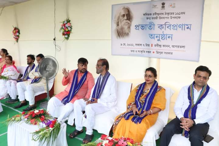 Hon’ble Information & Cultural Affairs, Sports, PWD (DWS) minister Sushanta Chowdhury paid floral tributes to Rabindranath Tagore on his 161st birth anniversary at Rabindra Kanan in Agartala on Monday (9th May, 2022). Hon’ble Deputy Mayor of Agartala Municipal Corporation (AMC) Manika Das Datta, Chairman of Tripura Tea Board Santosh Saha and other dignitaries were present.