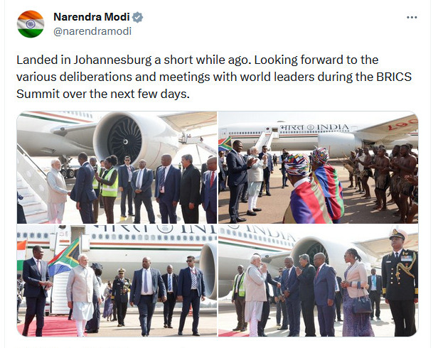 “Landed in Johannesburg a short while ago. Looking forward to the various deliberations and meetings with world leaders during the BRICS Summit over the next few days”, Hon’ble Prime Minister Narendra Modi tweeted.