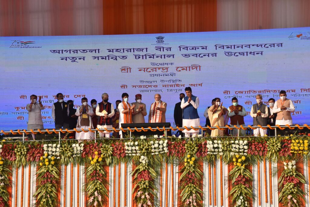 Hon’ble Prime Minister Narendra Modi on today (4th January, 2022) has inaugurated of New Integrated Terminal Building (NITB), MBB Airport and Launch of Mission 100 Vidyajyoti Schools and Mukhyamantri Tripura Gram Samriddhi Yojana in the presence of Hon’ble Governor, Tripura Satyadev Narayan Arya, Hon’ble Chief Minister Biplab Kumar Deb, Hon’ble Union Civil Aviation Minister Jyotiraditya Scindia, Hon’ble Deputy Chief Minister Jishnu Dev Varma, Hon’ble MP And Union Social Justice And Empowerment Minister Pratima Bhoumik and other dignitaries were present in inauguration ceremony.