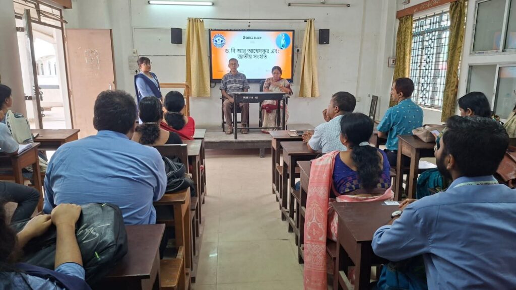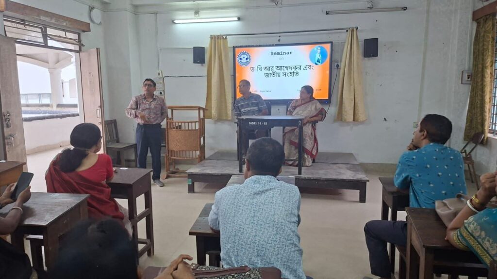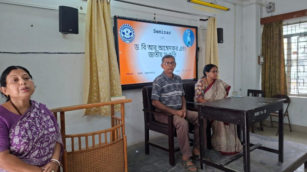 The seminar was presided over by the esteemed Dr. Ratna Roy, Principal of IASE Kunjaban, whose inspiring words set the tone for a meaningful and enriching academic dialogue. Distinguished faculty members and Associate Professors of the college – Dr. Santanu Bhattacharjee, Dr. Kishore Roy, and Dr. Abhijit Chanda – delivered insightful presentations, shedding light on Dr. Ambedkar’s monumental contributions to nation-building, constitutional democracy, social justice, and the idea of a unified India that transcends caste, creed, and religion. The event was further enriched by the enthusiastic participation of students, who came forward to share their research findings on Dr. Ambedkar’s extraordinary life, his relentless struggle against social discrimination, his vision of an egalitarian society, and his irreplaceable role in fostering national integration.