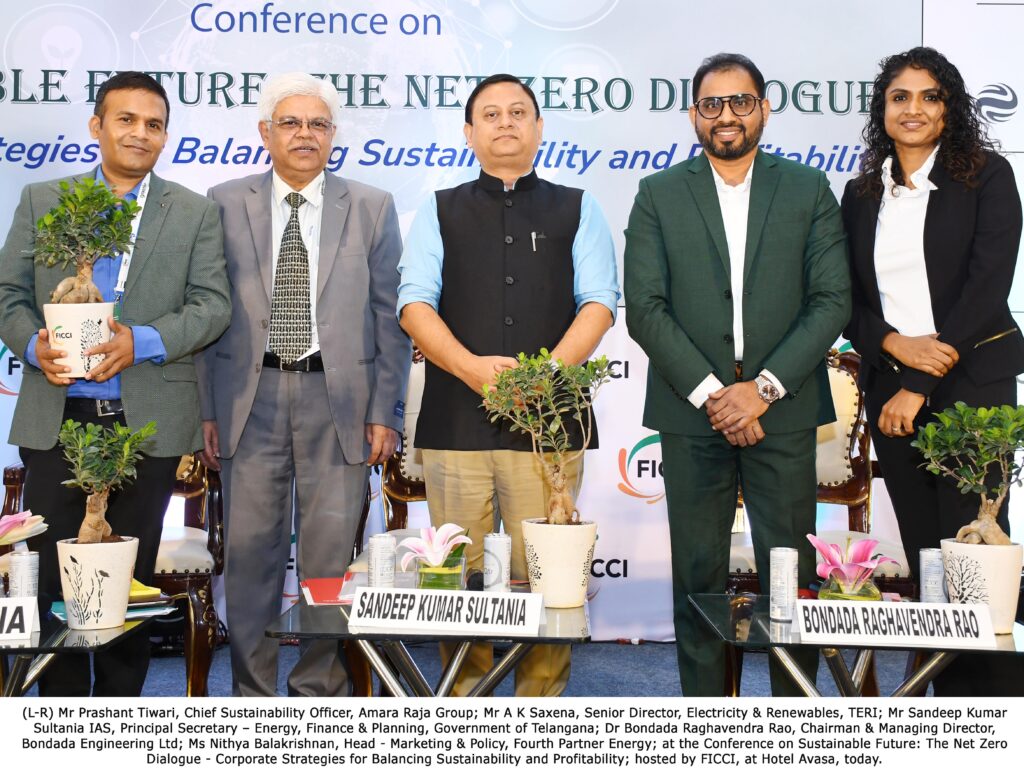 (L-R) Mr Prashant Tiwari, Chief Sustainability Officer, Amara Raja Group; Mr A K Saxena, Senior Director, Electricity & Renewables, TERI; Mr Sandeep Kumar Sultania IAS, Principal Secretary – Energy, Finance & Planning, Government of Telangana; Dr Bondada Raghavendra Rao, Chairman & Managing Director, Bondada Engineering Ltd; Ms Nithya Balakrishnan, Head – Marketing & Policy, Fourth Partner Energy; at the Conference on Sustainable Future: The Net Zero Dialogue – Corporate Strategies for Balancing Sustainability and Profitability; hosted by FICCI, at Hotel Avasa, today.