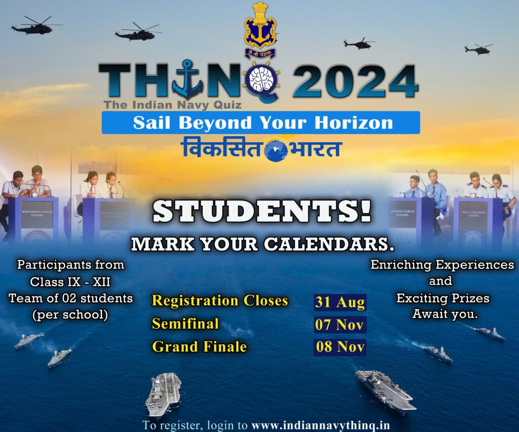 New Delhi, Delhi, 7th of August, 2024 : The Indian Navy announces the extension of date of registration of THINQ2024 till 31 Aug 24. Aimed to instill a sense of patriotism, self-reliance and pride in our rich heritage among young nation builders, the Indian Navy Quiz invites students from Class 9 to 12 across the country to be a part of this incredible quizzing event. The national level quiz competition is designed to offer the future leaders a chance to explore the Indian Navy. Keeping in line with the theme of ‘Viksit Bharat’, the THINQ2024 will be more than a test of knowledge.