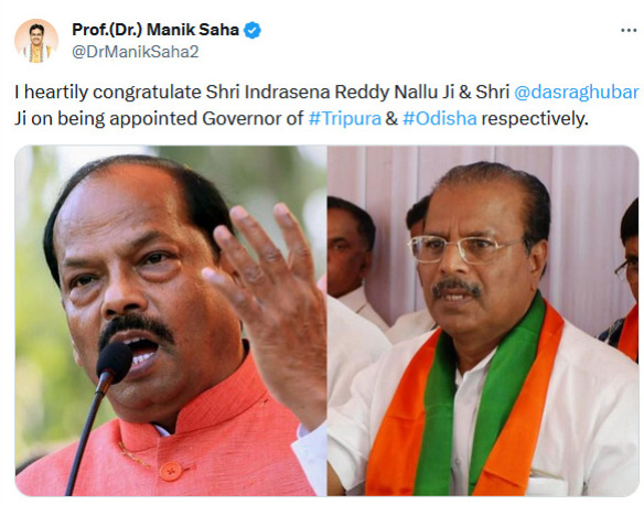 “I heartily congratulate Shri Indrasena Reddy Nallu Ji & Shri @dasraghubar Ji on being appointed Governor of #Tripura & #Odisha respectively.”Hon’ble Chief Minister Dr. Manik Saha tweeted.
