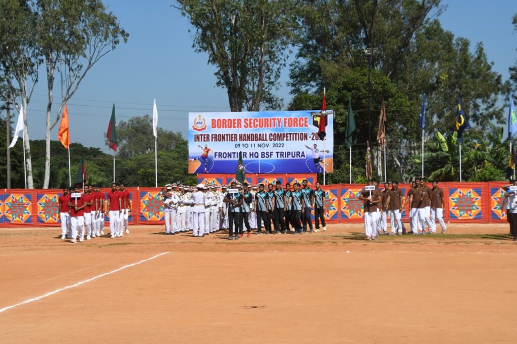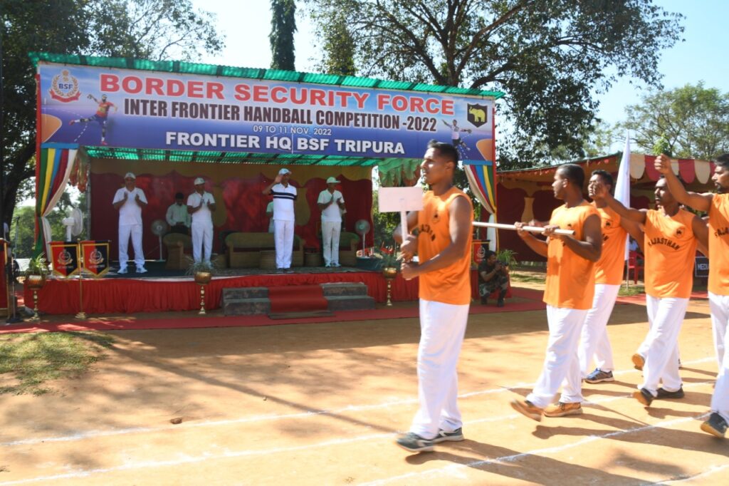 To mark the spirit of sportsmanship and to promote the idea of a healthy lifestyle among “Gallant” Bordermen, the yearly Inter Frontier Handball Competition 2022-23 is organized by Ftr HQ BSF Tripura from 09th Nov 2022 to 11th Nov 2022 at BSF Campus Salbagan, Agartala today. Shri Sumit Sharan, IPS, IG Frontier HQrs Tripura, BSF inaugurated the BSF Inter Handball Competition in the presence of Officers, Subordinate Officers and Jawans of the Border Security Force in a splendid ceremony. The opening ceremony witnessed a grand opening with an oath ceremony followed by a grand march past by teams under the flag of respective frontiers. During interaction with players Sh Sumit Sharan, IPS, IG BSF Tripura Ftr extended best wishes to all players to perform well and encash the opportunity to represent at national and international level.
