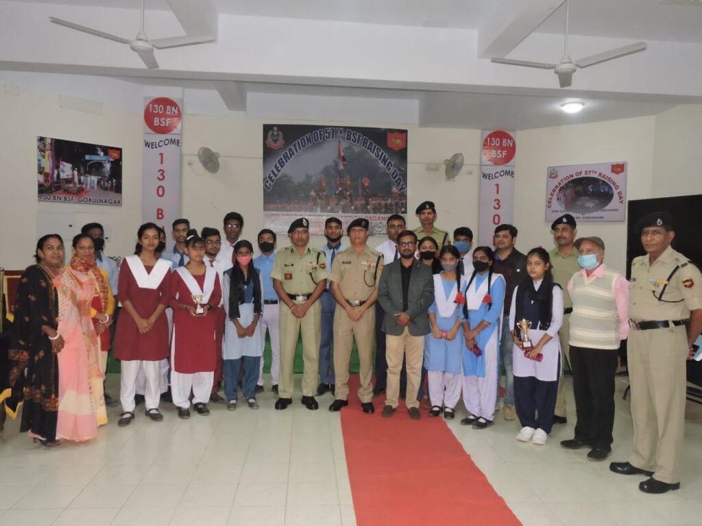 130 BN BSF organized Inter school quiz competition at Gokulnagar campus Sipahijala Tripura on 30th November, 2021. Raj Narayan Mishra Commandant 200 BN BSF inaugurated the inter school quiz competition in which children of four renowned school of locality participated. Children from Bishalgarh English medium school HS School, Bishalgarh Class 12 HS School, Office Tilla HS School and Vivekanand Shishu Niketan H.S. School vied for wines up trophy in the quiz. Vivekanand School was declared Winners and Bishalgarh English medium school HS School as runners up. The questions of the quiz were asked regarding BSF, 1971 war G K and modern history. The event was attended by Parents, teachers BSF officers, SOS and Jawans. This program was aimed to create awareness about BSF in public and to commemorate the golden jubilee year of liberation of Bangladesh.