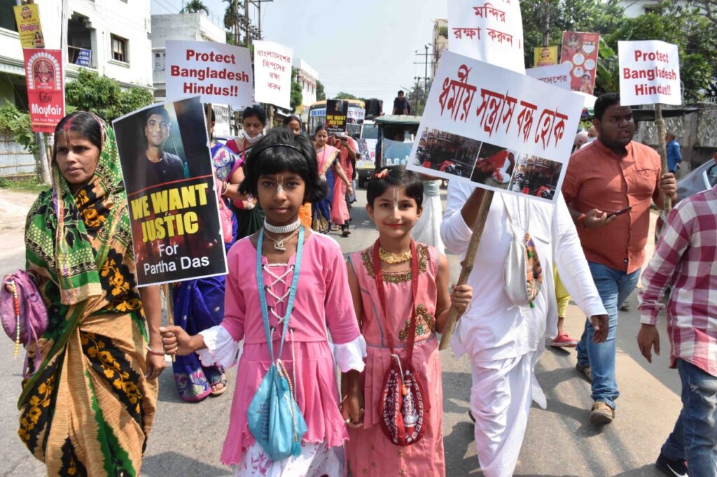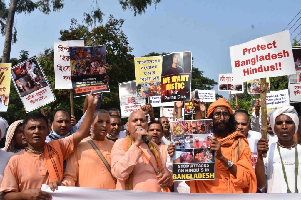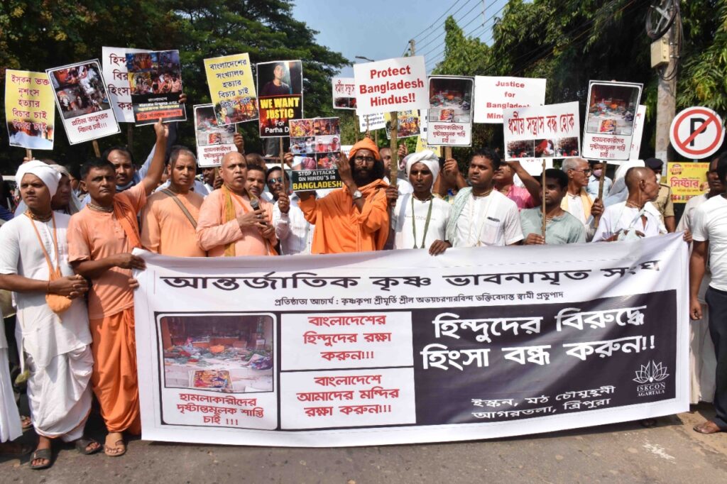ISKCON International society of Krishna members participate in a rally to protest against the alleged attack on Hindu community in Bangladesh on today (23rd October, 2021) in Agartala.