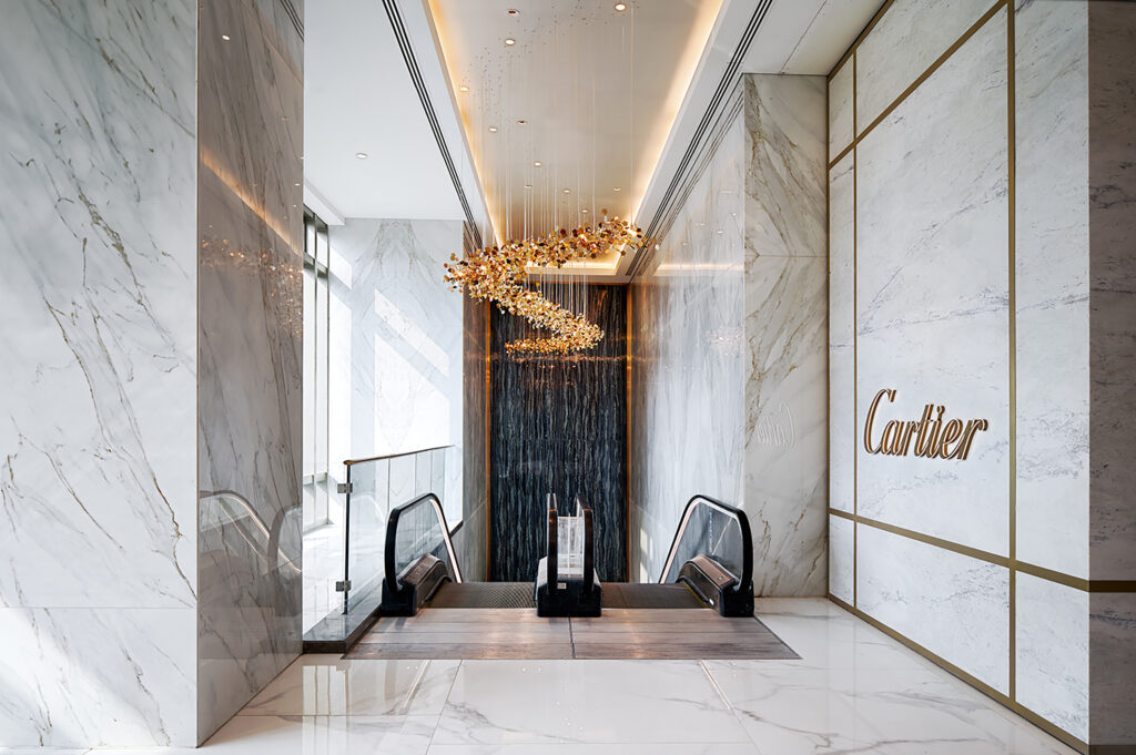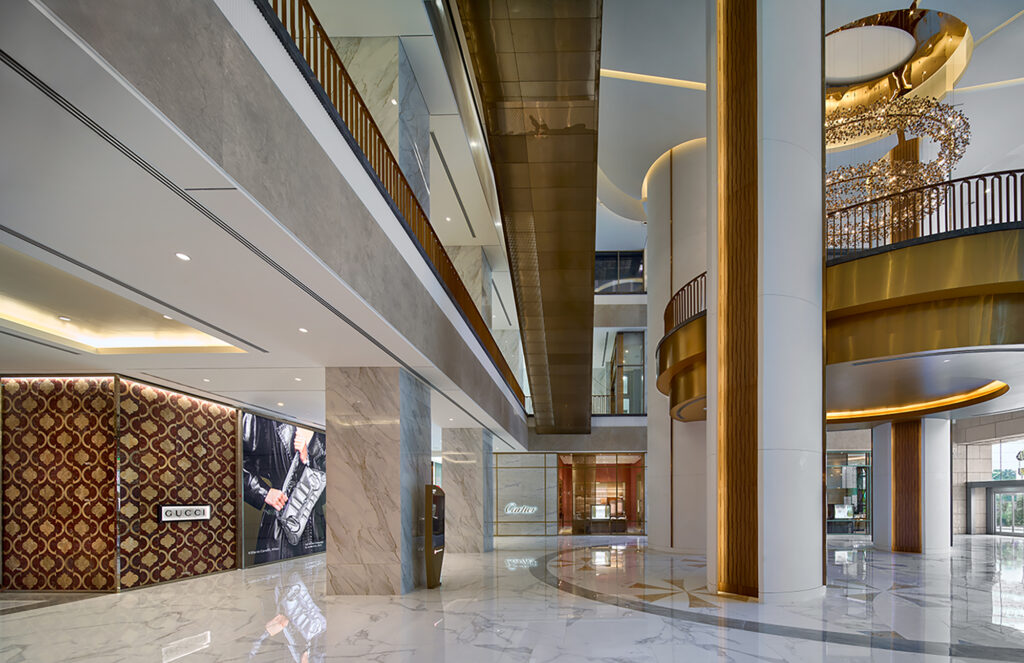 The Plaza’s structure, inspired by the lotus flower and other elements of nature, has been brought to life through a collaboration between TVS, a prestigious international architecture and design firm headquartered in the United States, and the Reliance team. The shopping concourse is punctuated with meticulously placed sculptural columns, that act as a visual thread weaving design continuity into the fabric of the space. Marble-clad floors, soaring vaulted ceilings, and an artful play of soft lighting coalesce harmoniously to establish a backdrop that exemplifies the essence of luxury.
