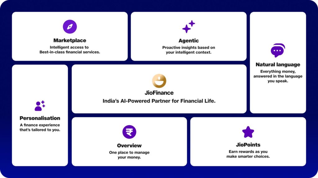 Marketplace for Intelligent Finance: An expansive digital storefront offering a diversified range of products from JFSL group companies and other trusted finance brands, including home loans, loans against securities, personal loans, credit cards, insurance, UPI, life and general insurance, JioBlackRock mutual funds and investment advisory, fixed deposits, digital gold, tax filing and planning, and an innovative savings account with automated liquidity management for higher returns.