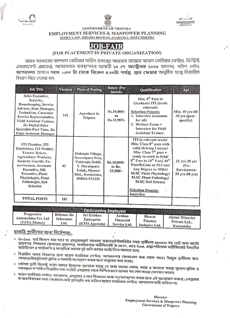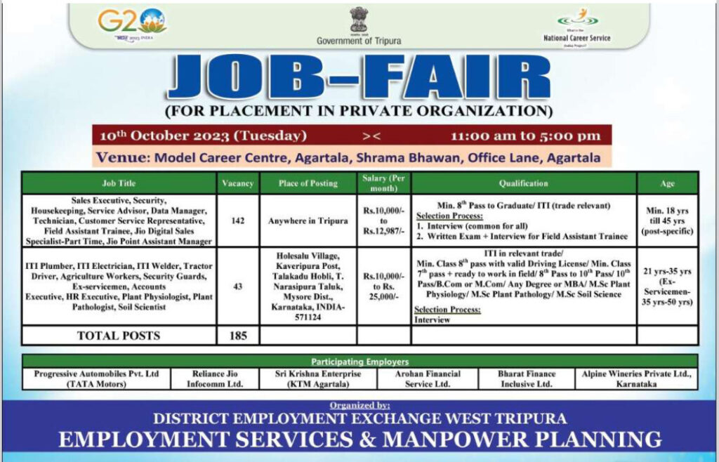 With the initiative of Directorate of Employment Services & Manpower Planning department, Government of Tripura organized Job Fair for Various Posts on 10th October, 2023 for placement in Private organization at Model Career Centre, Agartala, Shrama Bhawan, Office Lane, Agartala.
