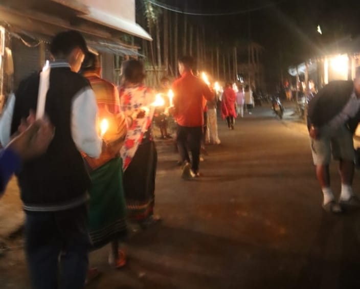Ampi, 30th of December 2023 : The Kaipeng Christian people of Tuidu have celebrated Gospel Day in Tuidu Binanda Khaw in Ampi nagar Gomati Tripura with great zeal and devotion. Thanks giving event, commemorating the 61st years of the Kaipeng Christianity in 2023 the Kaipeng Christian community celebrated this Gospel Day in great joy where a large number of believers have assembled to participate this auspicious religious event. The Kaipeng believers have conducted the program which was started by mass candle lighting, peaceful thanks giving March from Binandakhaw to Manjurliankhaw as well as Tuidu market road via KCC Church and ended up at Catholic Church Binandakhaw near Kaipeng Christian Diamond Jubilee memorial stone. The peaceful March was led by Pu Bulpanlian Kaipeng, Omnik Kaipeng, Pa Korlian Kaipeng, Pa Biaklur Kaipeng, Debnammoni Kaipeng and Bhumimoni Kaipeng. The program was initiated after holy opening prayer done by Pi Neirengsonti Kaipeng. There after Good news Gospel messages of God were delivered by Shri Hony Capt(Rtd) Muktaram Kaipeng, church elder of Roman Catholic Church. He said that Christian people have to love and respects one another as Jesus Christ our Lord loves us all.