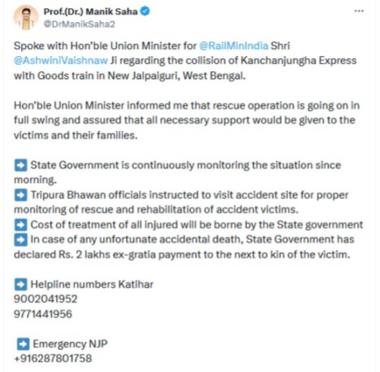 Hon’ble Chief Minister of Tripura Dr. Manik Saha tweeted, “Spoke with Hon’ble Union Minister for @RailMinIndia Shri @AshwiniVaishnaw Ji regarding the collision of Kanchanjungha Express with Goods train in New Jalpaiguri, West Bengal. Hon’ble Union Minister informed me that rescue operation is going on in full swing and assured that all necessary support would be given to the victims and their families.