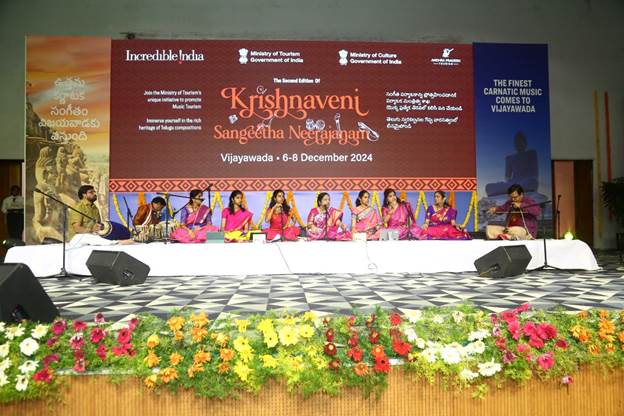 New Delhi, Delhi, 9th of December, 2024 : The Krishnaveni Sangeetha Neerajanam 2024 successfully concluded in Vijayawada after three days of musical devotion and cultural celebration. Organized by the Ministry of Tourism, Government of India, in association with the Ministry of Culture, Ministry of Textiles, and the Government of Andhra Pradesh, this festival paid homage to the rich legacy of Telugu culture and Carnatic music. It featured captivating performances by renowned artists and provided an invaluable platform for emerging talent.