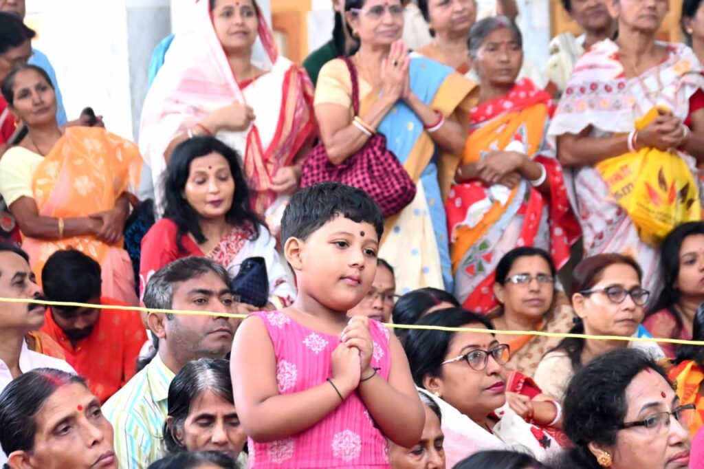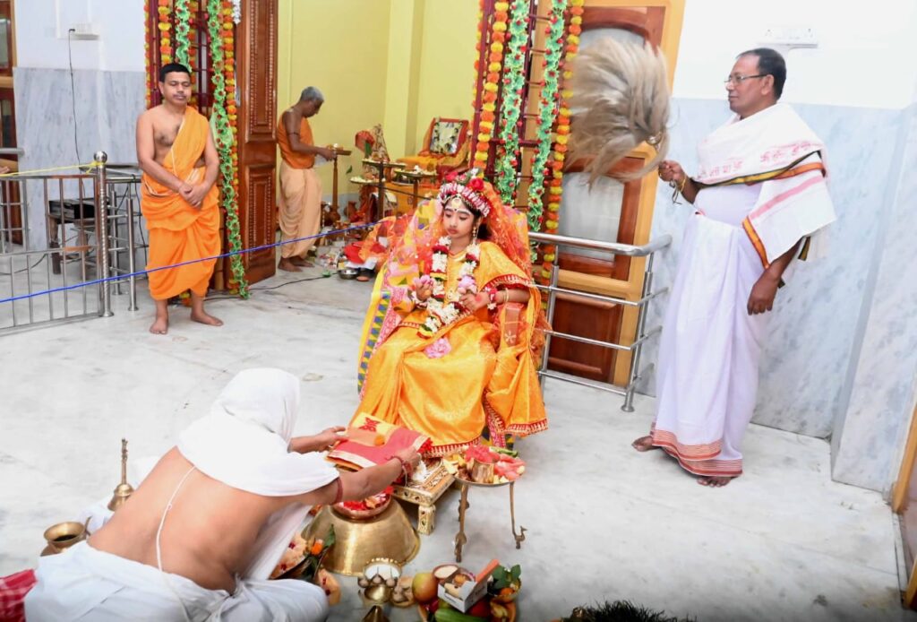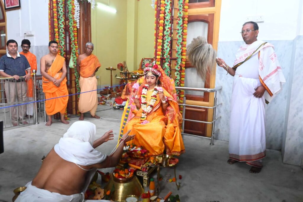 Draped in a red sari, seven-year-old Ditipriya Bhattacharjee from Bhati Abhaynagar, Father Dibyendu Bhattacharjee and Mother Supreeti Chakraborty was a live incarnation of Goddess Durga during Kumari Puja performed on the occasion of Maha Ashtami at Anandamayee Ashram. She is a class Two student of Shri Krishna Mission School.