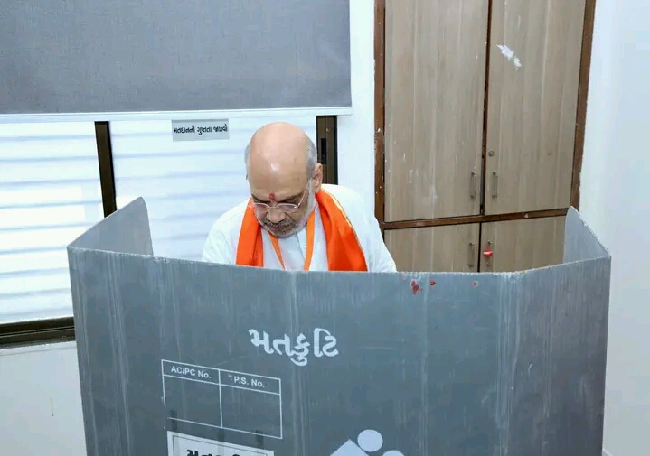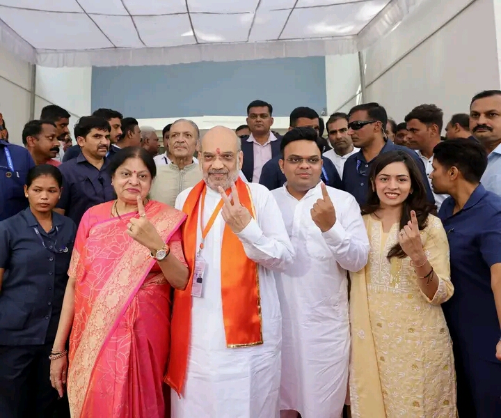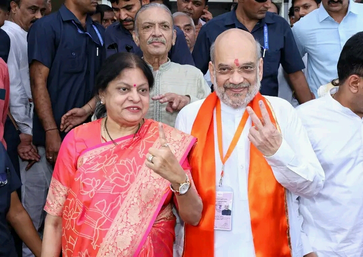 Gujarat, 7th of May, 2024 : Union Home Minister Amit Shah cast his vote at a polling booth in Ahmedabad under the Gandhinagar Lok Sabha constituency in Gujarat on Tuesday (7th May, 2024). Union Home Minister Amit Shah contesting to retain the Gandhinagar Lok Sabha seat. The Union Home Minister was accompanied by his wife Sonal Shah, son Jay Shah other family members.