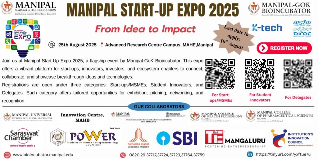 Manipal, 9th of August 2025 Bioincubator of Manipal Academy of Higher Education (MAHE), an Institution of Eminence Deemed-to-be University, is set to host the prestigious Manipal Start-Up Expo 2025 on August 25, 2025, at the Advanced Research Centre Campus, Manipal. M-GOKB, a Technology Business Incubator established by MAHE and supported by Karnataka Innovation and Technology Society (KITS), Government of Karnataka, and Biotechnology Industry Research Assistance Council (BIRAC), Department of Biotechnology, Government of India, serves as the driving force behind this initiative, dedicated to fostering and scaling start-ups by providing a nurturing ecosystem for technology-based innovation and supporting the entrepreneurial journey from ideation to product commercialization. This flagship event promises to be a dynamic showcase of India’s most innovative minds and breakthrough technologies.