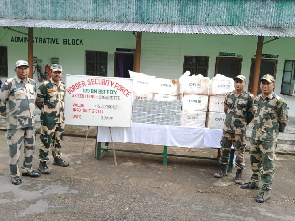 In another operation BSF troops of BOP Amlighat under District South Tripura recovered 08 catoons containing 15,400 packets of Oris & Mond Cigarette worth Rs 32 lakhs.