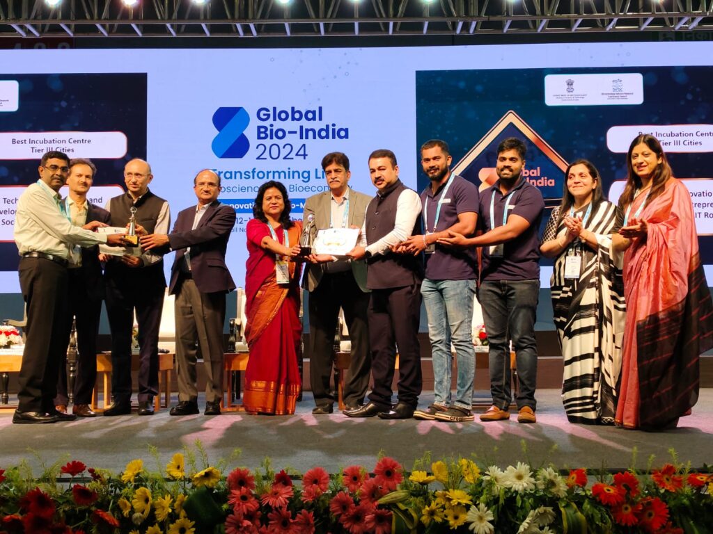 Manipal, 16th of September, 2024 : Manipal -GoK Bioincubator has been recognized as the “Best Incubator” in the Tier 2 Cities category by the Biotech Industry Research Assistance Council (BIRAC), under the Department of Biotechnology, Government of India. This prestigious award was presented during the Global Bio India 2024 event, held on 14th September 2024 at Pragati Maidan, New Delhi.