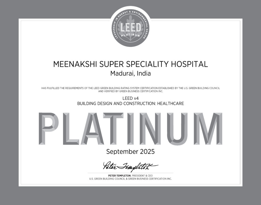 Madurai, 19 September 2025: Navigating a pathbreaking achievement for Indian healthcare and sustainable architecture, Meenakshi Super Speciality Hospital (MSSH) has become the first Indian hospital to earn the LEED v4.0 Platinum Certification in the Healthcare category. This recognition is awarded by the U.S. Green Building Council (USGBC) and verified by Green Business Certification Inc. (GBCI), draws new benchmark for sustainable medical infrastructure.