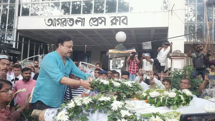 President of Agartala Press Club Pranab Sarkar, Vice President of Agartala Press Club Chitra Roy, Joint Secretary of Agartala Press Club Abhishek Dey, Kamal Chowdhury, other members of Agartala Press Club and journalists paid last respects to Senior Journalist & News Editor of Dainik Sambad Pradip Datta Bhowmik in front of Agartala Press Club, Tripura on Monday (21st July, 2025).