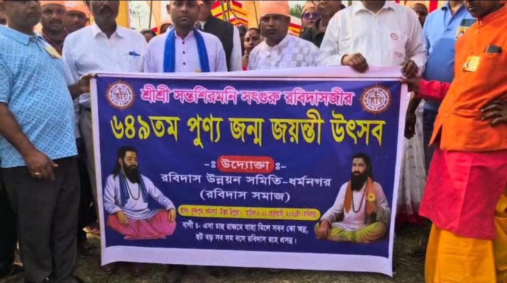 Dharmanagar, Tripura, 1st of February, 2026 : The 649th sacred birth anniversary of Shri Shri Sant Shiromani Guru Ravidas Ji was observed with due reverence and dignity on Sunday in the Dharmanagar subdivision of North Tripura, conveying a strong message of religious and social harmony. The programme was organized by the Ravidas Development Association, Dharmanagar (Ravidas Samaj), and witnessed enthusiastic participation from devotees and members of the wider society, creating a festive atmosphere from the early hours of the day.The main attraction of the celebration was a colourful procession that highlighted the ideals of Guru Ravidas —equality, humanity, and social justice.