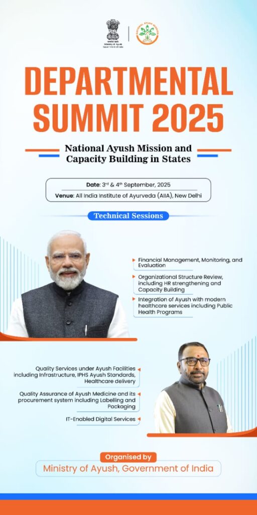 New Delhi, Delhi, 31st of August, 2025 : The Ministry of Ayush is all set to organize a two-day Departmental Summit themed “National Ayush Mission and Capacity Building in States” on 3rd and 4th September 2025 at the All India Institute of Ayurveda (AIIA), Sarita Vihar, New Delhi. The summit will be chaired by Shri Prataprao Jadhav, Union Minister of State (Independent Charge), Ministry of Ayush and Minister of State for Health & Family Welfare.