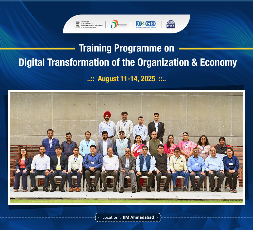 New Delhi, Delhi, 14th of August 2025 : The Ministry of Electronics and Information Technology (MeitY) under its Digital India Vision plans and implements its capacity building initiatives in Digital Governance. As part of this, a 4-day training programme on ‘Digital Transformation of the Organization & Economy’ has been organized at the Indian Institute of Management, Ahmedabad from August 11 – 14, 2025 by National e- Governance Division (NeGD), MeitY for the officials of Central and State Governments across the country. A total of 27 officers from various Central Line Ministries and States/UTs, including Andhra Pradesh, Bihar, New Delhi, Lakshadweep, Madhya Pradesh, Puducherry, Rajasthan, Telangana, Uttar Pradesh and West Bengal participated in the programme.