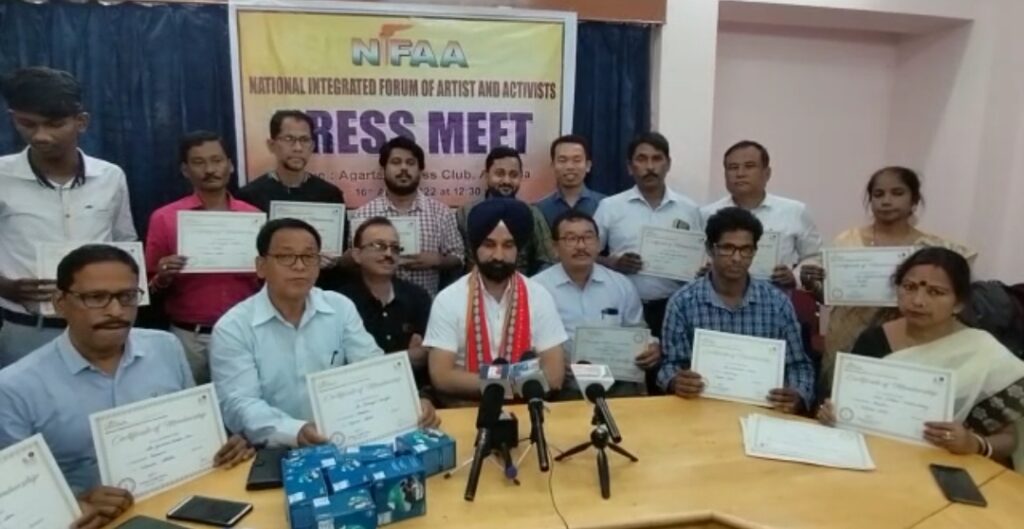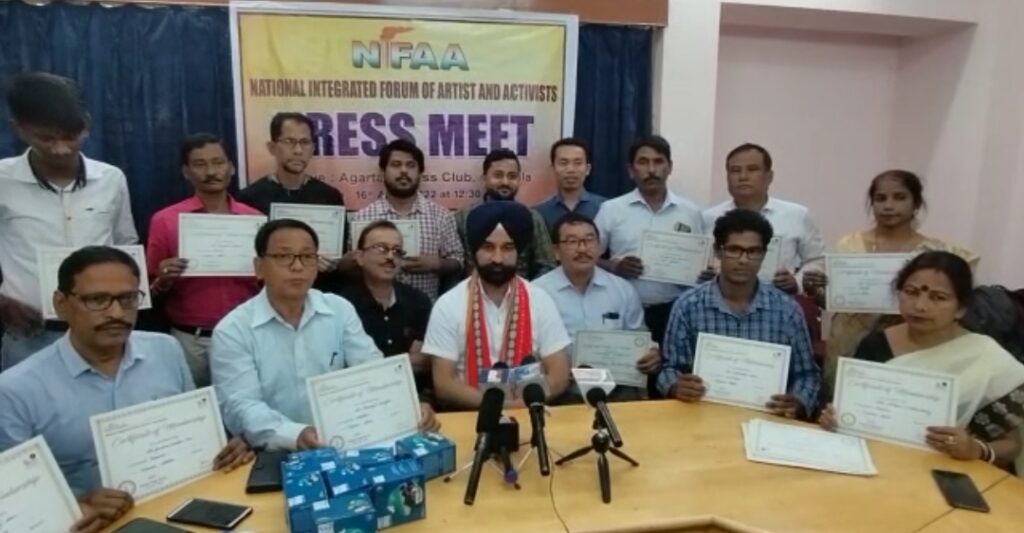 National Integrated Forum of Artists & Activists (NIFAA) held a Press Conference at Agartala Press Club, on Saturday (16th April, 2022). The National Cultural Festival to be held in the state from 23rd November to 25th November 2022 according to a press conference statement. The festival will be attended by various cultural groups and representatives from different parts of the country. Cultural groups from will also take part in the Bhangra dance of Punjab, Chhau dance of West Bengal and Bihu dance of Assam. A full committee meeting of the NIFAA Tripura State Branch was held at the Agartala Press Club in accordance with the NIFAA National rules policy. At that meeting, twenty three members NIFAA State Committee was formed. Bibhuti Debbarma has been elected as the President of this newly appointed committee, Sanjay Sen has been elected as the Vice President and Dipak Kumar Sinha has been elected as the Assistant Secretary. Pritpal Singh Pannu, Founder Chairman, Animesh Deb Roy (Kolkata), President of NIFAA and NIFAA members were present at the press conference.