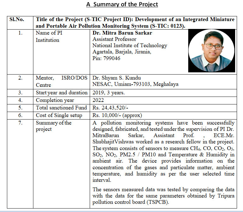 Among eight of the approved incubation projects sanctioned under the Space Technology Incubation Centre (S-TIC) NIT Agartala, four have been successfully completed and rest four are going to achieve their milestones shortly. As an outcome of these completed projects, one product, entitled “Integrated, Miniature and Portable Air Pollution Monitoring System” has been developed and is handed over to ISRO. The main features of this portable Air Pollution Monitoring System is that it can monitor concentrations of different greenhouse/ trace gases like CO, CO2, methane, ozone, SO, NO, and fine particulate matters along with physical parameters like temperature, relative humidity, etc. in real time for any location of particular a longitude and latitude through an indigenously developed mobile app for data visualization.