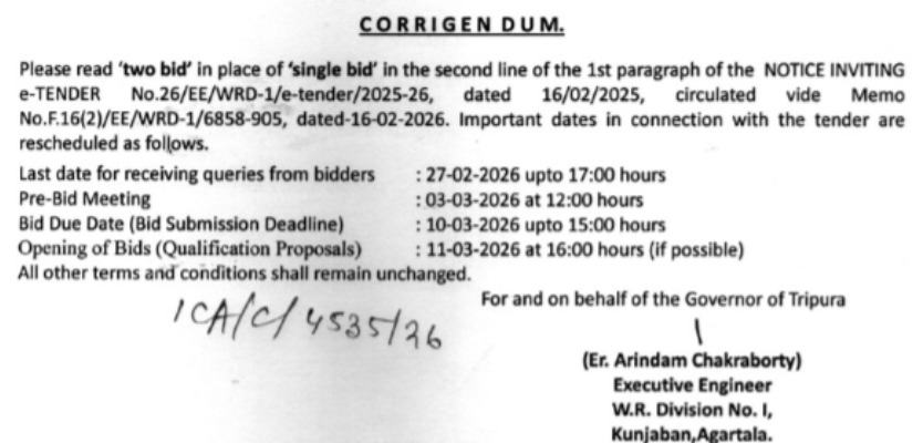 Agartala, Tripura, 25th of February, 2026 : NOTICE INVITING e-TENDER No.26/EE/WRD-1/e-tender/2025-26, dated 16/02/2025.