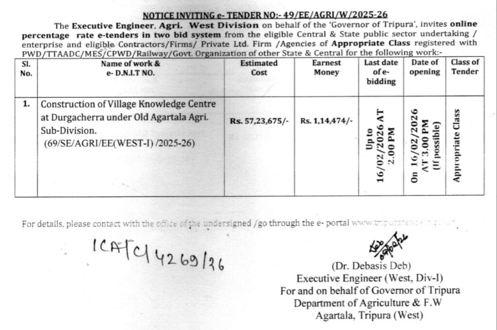 Agartala, Tripura, 11th of February, 2026 : NOTICE INVITING e- TENDER NO:- 49/EE/AGRI/W/2025-26.