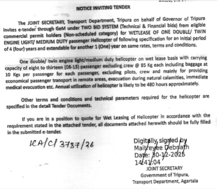 Agartala, Tripura, 9th of January, 2026 : Notice Inviting Tender (NIT).