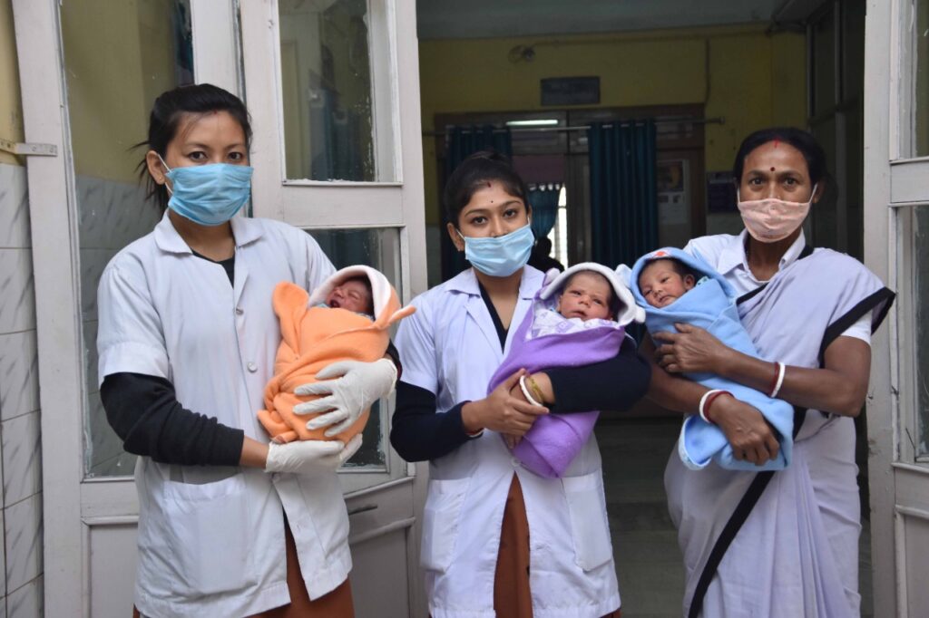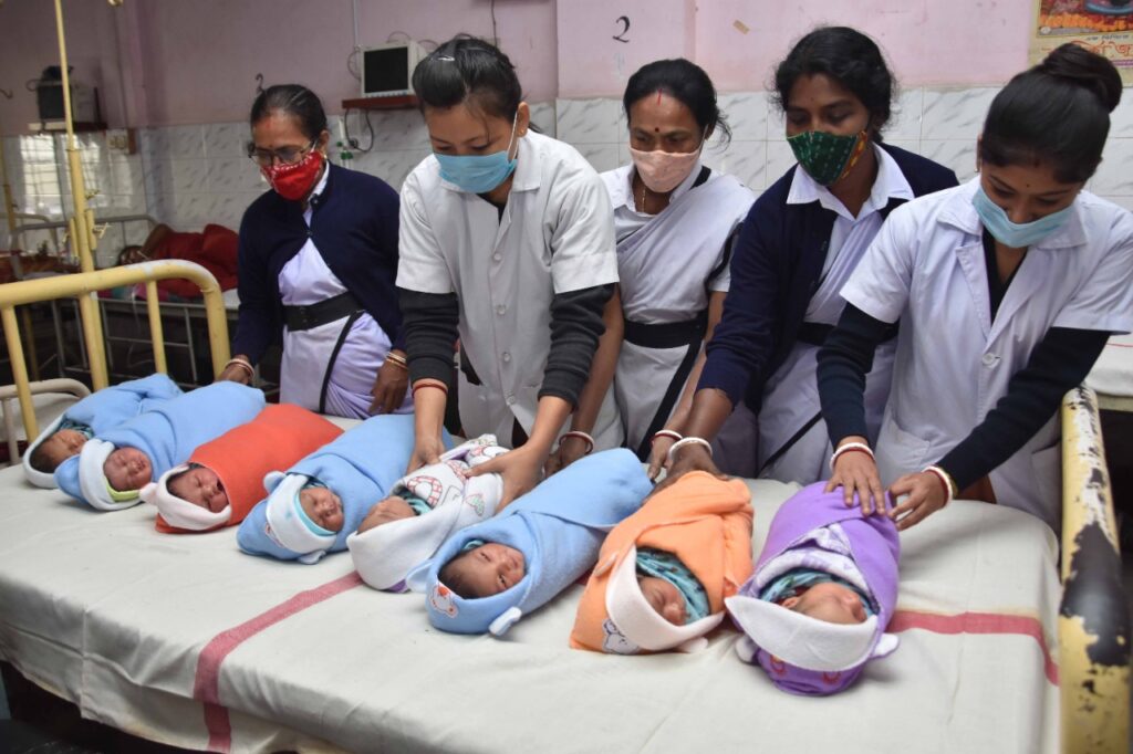 Nurses hold babies born on the first day of the New Year 2022 in Agartala On 1st January 2022.