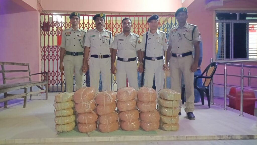 Sonamura, Tripura, 10th of August 2025 : Sonamura police during patrolling duty at Bathadola area near Indo-Bangla Border Fence and recovered 60 kg dry cannabis (Ganja) which covered by brown colour cellotape on Tuesday (12th August, 2025) night.